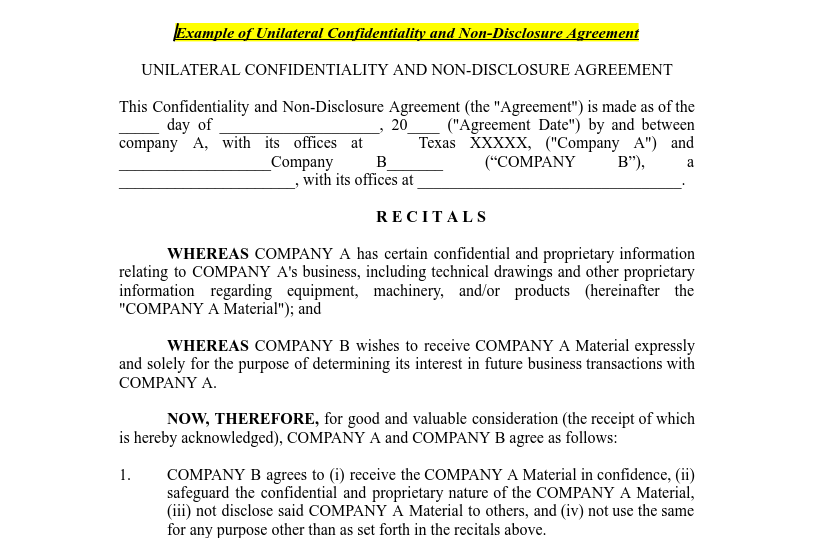 You can find examples of a Unilateral and Bilateral (or Mutual) Non-Disclosure Agreement by clicking on the links below.